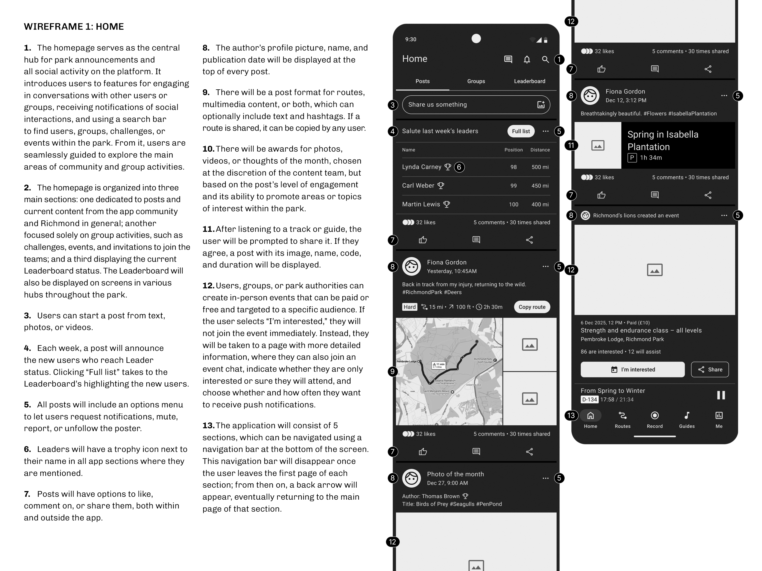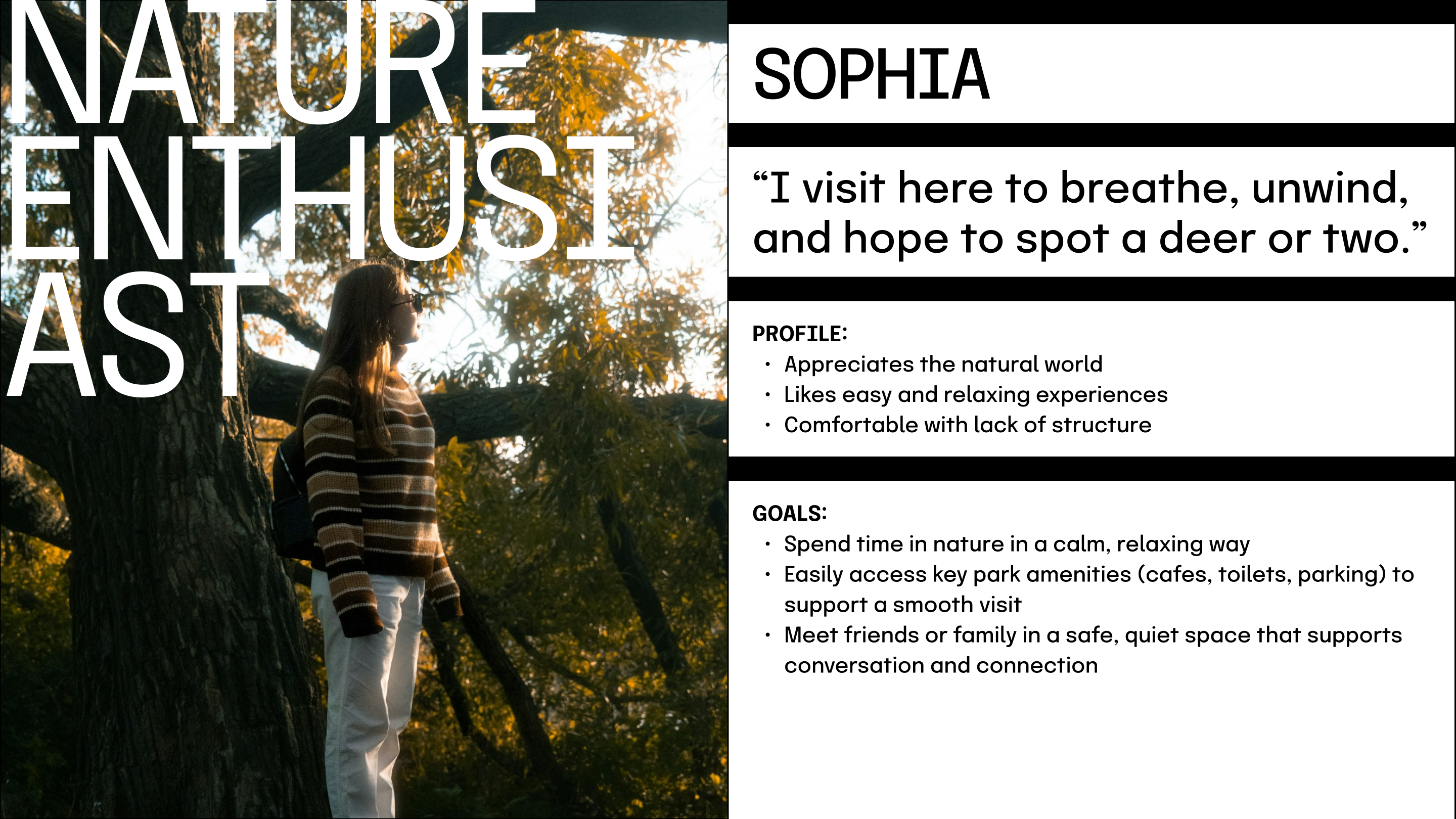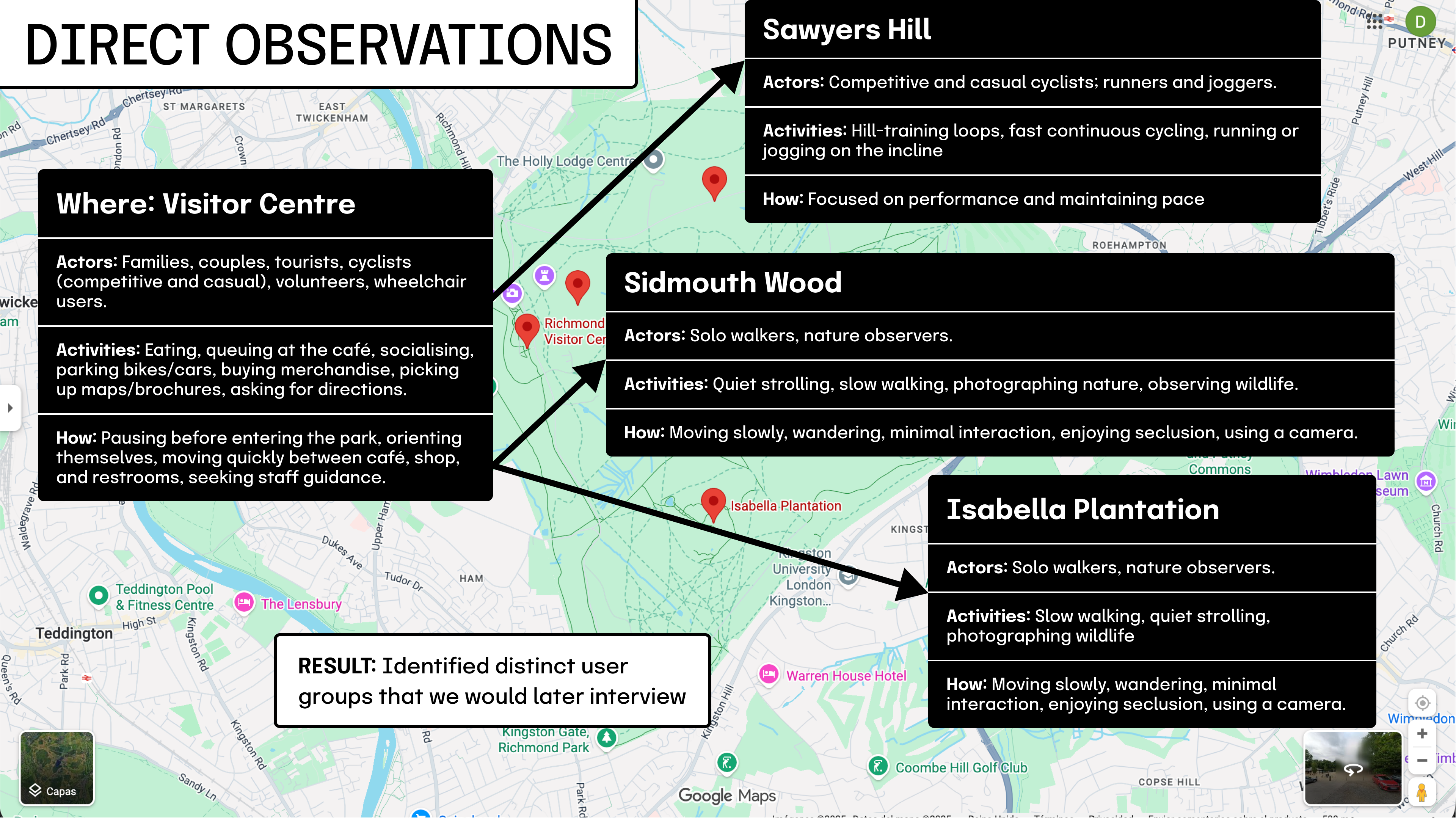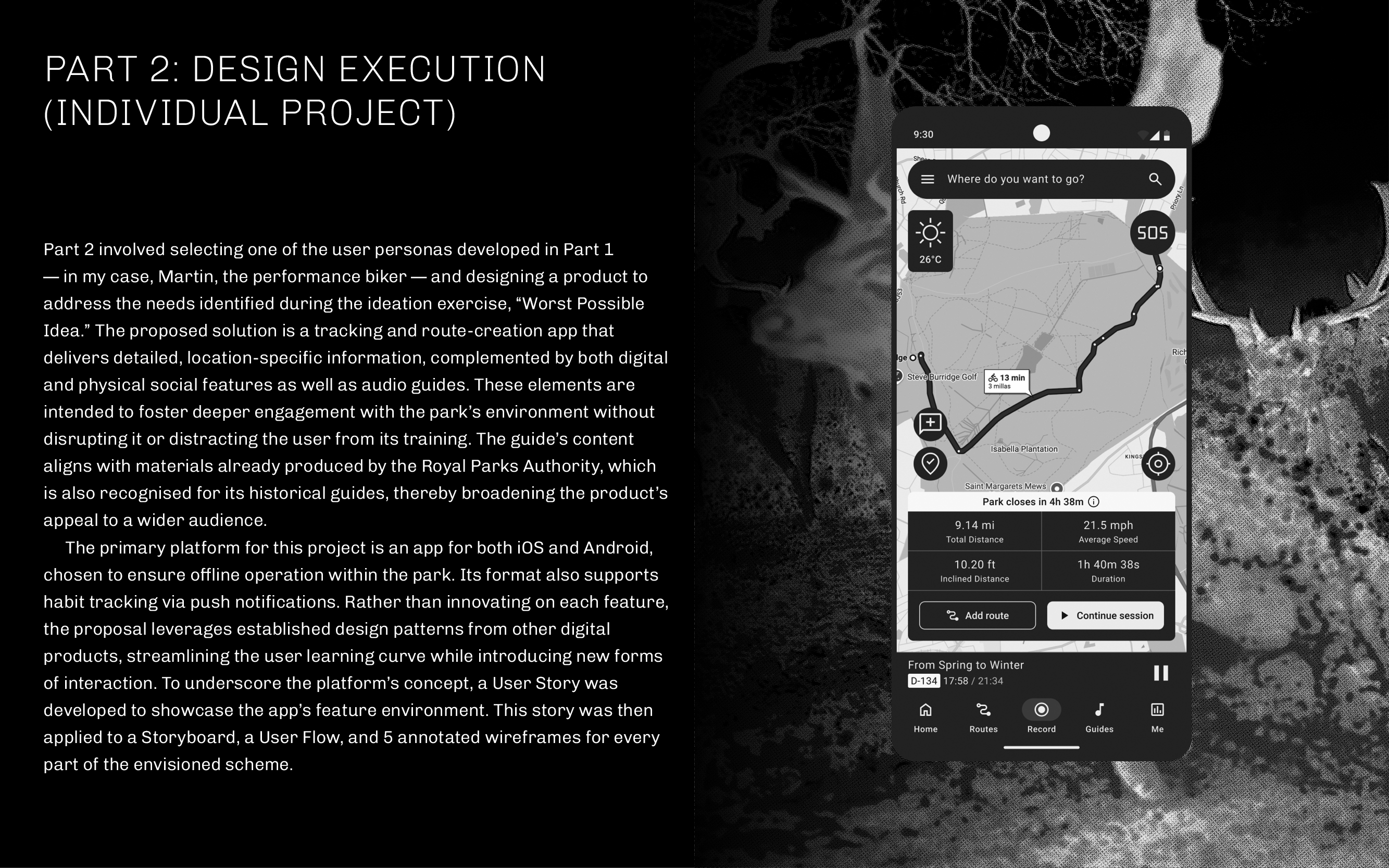 The project consists of two interconnected parts that together form a single design initiative. Its objective was to explore a range of user-centred interaction design methods to develop an innovative digital technology that enhances how people experience one of London’s parks or open spaces. For this, Richmond Park was selected, the largest park in London and widely known for its rich flora and fauna, making it a prime location for nature observation.